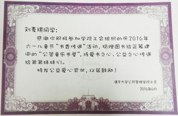 图为工会为捐赠图书的小朋友制作的爱心奖状。