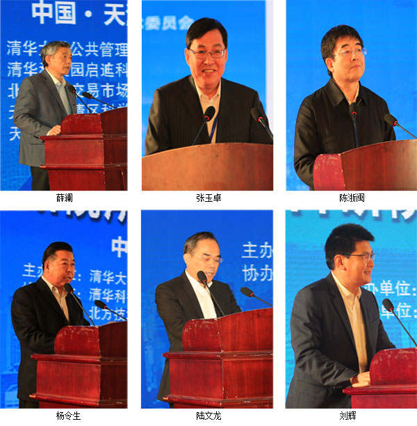 在开幕式及嘉宾主题演讲环节,天津市科学技术委员会主任陆文龙和清华公管学院院长助理、高级培训中心主任刘辉分别主持开幕式和主题演讲,中国工程院院士、神华集团党委书记、董事长张玉卓,中国石油化工集团科技部主任谢在库,启迪控股股份有限公司常务副总裁、启迪科技股份有限公司董事长兼总经理王书贵,一带一路投资基金董事长林恒宇,中铁第六勘察设计院集团有限公司副总经理、总工程师范建国分别进行主题演讲,他们演讲的主题分别是“神华产学研协同科技创新的探索与实践”“能源化工协同科技创新实践”“科技服务业促进跨界融合与协同创新”“构建全球并购驱动下的跨界创新平台”“依托京津冀协同发展建设轨道交通试验和装备制造业基地”。