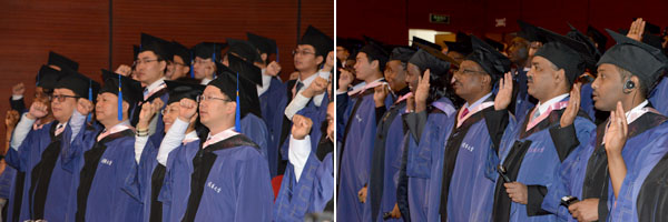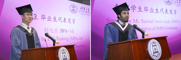2014级MPA刘旭东、2016级IMPA Samuel Aron Issak(厄立特里亚)分别作为中国毕业生和留学生毕业生代表发言。两位同学满怀深情地回忆了在公管学习生活的点点滴滴,诚挚地表达了对学院和老师的感激之情,引起现场师生的强烈共鸣。他们表示将牢记“明德为公”的训导,将“自强不息,厚德载物”内化为自身的精神品格,为人类的公共管理事业贡献出自己的一份力量。