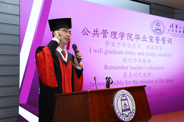 2012级博士陈思丞带领全体毕业生,举起右手握拳进行庄严宣誓。“铭记师长教诲,肩负时代使命;弘扬清华精神,投身公管事业。明德为公,执政为民;精邃做事,正心为人;青衿矢志,求真笃行;言出身随,誓底功成。”既感恩学院的栽培,又明志在未来的工作中继续投身于公共管理事业。
