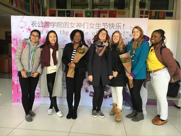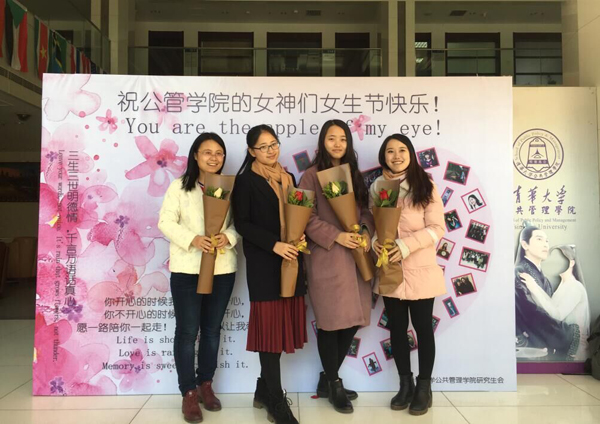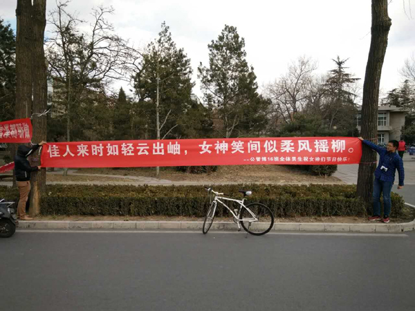 同时,各班也以各种各样的形式为女生们庆祝节日:除了别出心裁的横幅外,硕16班的同学们一起吃披萨、玩桌游,男生们为每一位女生准备了一张写满祝福的明信片;