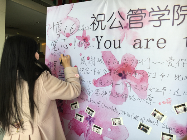 早上九点到下午两点,公管研会在学院一层大厅举办了女生节庆祝活动。女生们可以抽取一份小礼物,并在照片墙前拍照留恋,得到一张特别订制的拍立得照片。照片墙上是活动前收集的各班女生的照片,记录着大家的大学时光。此外,同学们还在留言板上写下自己的寄语和祝福。
