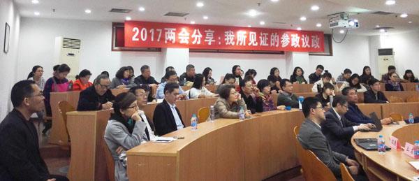 过勇指出,“两会”精神学习讲座是学院历史悠久的学习活动之一,可以让大家在第一时间领会“两会”精神。今年是关键的一年,下半年党的十九大即将召开,我们也需要从学术研究的角度总结党的十八大以来、十二届全国人大、全国政协成立以来,国家发生的一系列变化以及中央对全国人民作出的专项承诺在过去四年所取得的进展。王名老师用自己参加两会的经历,让我们获取了更多的信息,了解国家的发展方向。而对于公管学院的师生来说,更重要的是,在这个过程当中体会作为一名从事政策研究的学者,如何把我们的专业知识用到国家的政策发展、政策研究中去,参与到政策建议的过程中去。王名老师在这方面为我们作出了非常好的表率。