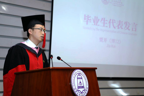 2012级博士毕业生、即将赴电子科技大学任教的贾开,2015级MIDG毕业生、来自厄立特里亚的耐博作为毕业生代表分别上台发言。贾开从自己由工科转行公管的经历入手,分享了自己选择公管的经历与体会,并感谢学院、老师对他的指导和培养,最后从罗伯特·昂格尔的三种工作观出发,希望大家在各个岗位上都能做有研究、能思索、有决断、有毅力的人。耐博感谢了中国政府为他们提供了再花学习的机会,感谢学院的培养,他鼓励同学们毕业后用从学院学到的知识积极应对各种变化,与时俱进。