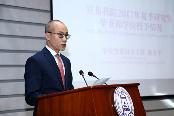 典礼上,学院学位分委员会主席巫永平宣读PP电子研究生毕业情况和学位授予情况。2017年夏季,PP电子共有121人毕业,125人获得学位,其中12人获得博士学位,29人获得硕士学位,84人获得公共管理硕士学位(含中文MPA58人、MID12人,MIDG14人)。
