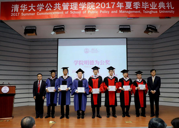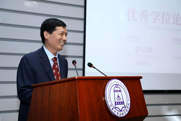 在颁奖环节,校党委常委、学院党委书记过勇宣读了获得2017年“明德为公”奖的名单,共有七位毕业生获奖,他们毕业后将奔赴各级公共服务部门工作。副院长杨永恒、朱旭峰为获奖同学颁奖。副院长彭宗超宣读了获得优秀学位论文名单,并由导师亲自颁发证书。