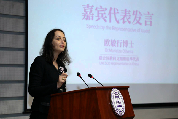 联合国教科文组织驻华代表欧敏行博士作为嘉宾代表上台发言。她向毕业生们提出了四个方面的要求,希望大家能够实现自我价值,追求自己与他人的幸福,尊重身边每一个平等的人,联系发展的看待这个世界。