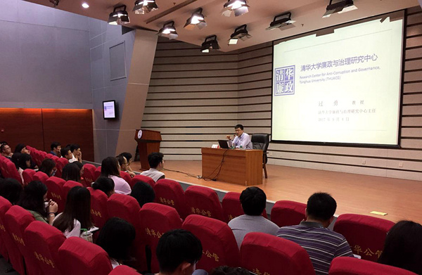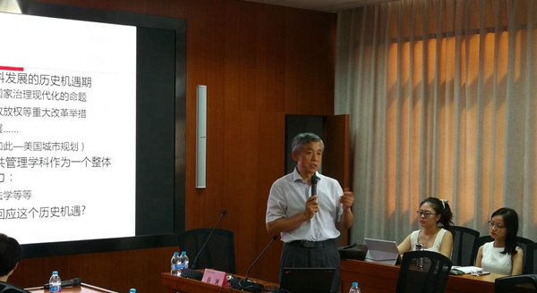 图为清华公管学院院长薛澜教授作《公共管理前沿问题报告》。