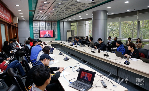10月18日上午,清华公管学院组织学院师生及培训学员收看中国共产党第十九次全国代表大会开幕会,在学院302会议室、428教室和报告厅三个场地进行了直播。学院党办在会议召开前制作了宣传海报、向师生发送通知邮件,并要求各支部积极组织收看,将学习党的十九大作为支部组织生活主题。