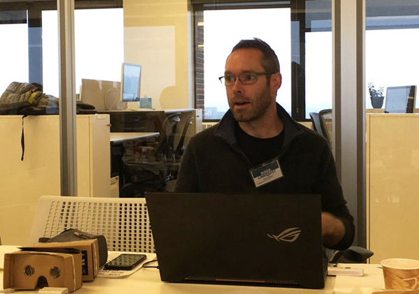 图为密歇根大学可持续发展案例中心副主任Mark Lindquist展示实验室在虚拟现实方面的工作,探讨运用该技术加强案例学习的可能性。