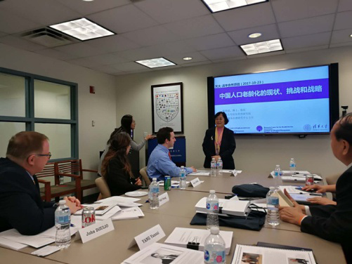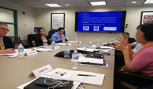 就业与社会保障研究中心副主任刘广君介绍了中国养老服务需求评估的体系和一般方法,并汇报了从需求、供给和购买力三个维度构建养老服务体系的基本情况。特别就养老服务中老年人的权益维护和使企业安全运营的法律体系;如何引导和监督养老服务机构对老人服务需求的送达和资源分配;如何评估政府购买下的企业的服务效果监督及评估体系等内容向美方提出咨询。