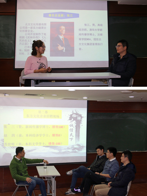 课堂上,2016级MPA同学根据自身兴趣和研究领域组成8个小组,将课程内容和工作中遇到的真实案例相结合,用社会剧场的方式进行表演。同学们分别围绕海监系统改革、央企员工职业发展、企业招聘与用人、武警编制体制改革、中层干部激励机制、基层公务员绩效评定、乡镇基层组织管理、村级干部定位与监管等方面的案例,结合课堂上所学组织变革与变革管理、组织人员聘任、绩效和薪酬管理等相关理论进行表演,将此前日常公共部门管理实践中遇到的现实问题再现在课堂上,其中,既有对管理实践的反思,又有对管理理论的探讨。
