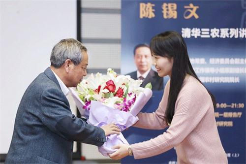 最后,学生代表上台献花,对陈锡文教授两个多月来的精心授课致以敬意和感谢。