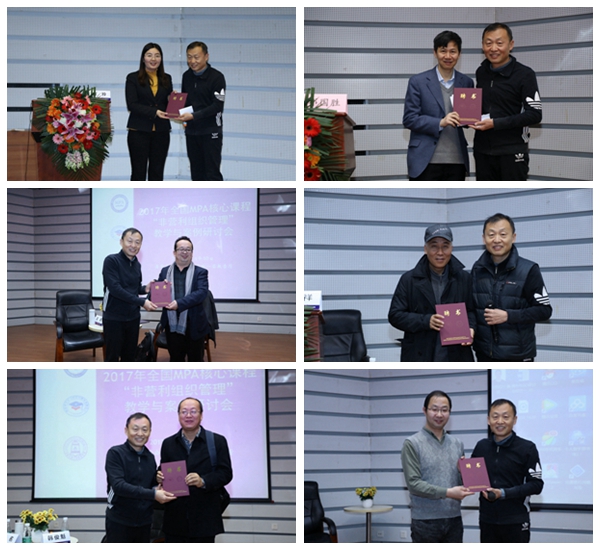 图为王名为各位专家颁发全国MPA教指委授课专家聘书。