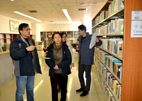 图为清华公管学院副院长朱旭峰(前排左一)陪同商务部培训中心副院长何定(前排右一)一行3人巡检清华公管学院图书馆。