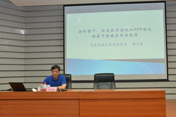 开班仪式结束后,韩志峰做了题为“新形势下推进投资建设和PPP模式健康可持续发展的思考”的开班报告。韩志峰从“什么是新形势、怎么理解新形势”、“关于PPP模式的几点看法”、“建立合理的投资回报机制”等几个方面出发,为学员们分析了当前的投资环境新特点、投资形势新变化、投资管理新要求和基础设施投融资新趋势。韩志峰鼓励大家要坚定信心,合力推进中国PPP事业行稳致远。
