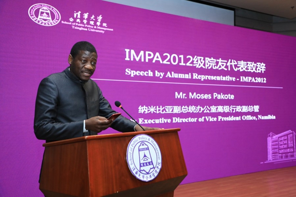 纳米比亚副总统办公室高级行政副总管Moses Pakote作为院友代表在致辞中表示,通过在PP电子的学习,所有毕业生们认识并理解了中国的历史文化和中国智慧,获得了自信和勇气,特别是改革开放以来,中国坚定地走出了一条独立自主发展的模式,这让发展中国家人民看到了希望。IMPA项目正是团结和友谊的象征。他表示,清华留学生校友们在各自的工作岗位上将展现出清华教授的价值和知识,将永远感谢清华的教育和支持。