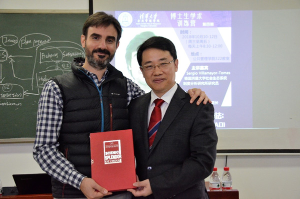 王亚华教授全程参与了课程的培训,与同学们一道记笔记、参与课堂提问与讨论。王亚华教授在课程结束时指出,SESMAD是公共池塘资源理论和公共事物治理理论发展的前沿技术,是研究大型公共池塘资源治理领域的重要方法之一,对于中国的公共事物治理有重要的参考价值。课程结束之际,王亚华教授代表公管学院赠送《中国国家地理》杂志纪念册给维拉梅尔-托马斯以示感谢。