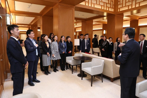 研修班班长、国际教育办公室副主任廖莹代表班委会总结。国际处副处长孟波介绍学校全球战略的最新进展,苏世民书院院长助理邱嵩介绍了苏世民书院的整体情况。最后,全体嘉宾、学员在苏世民书院中庭合影留念。