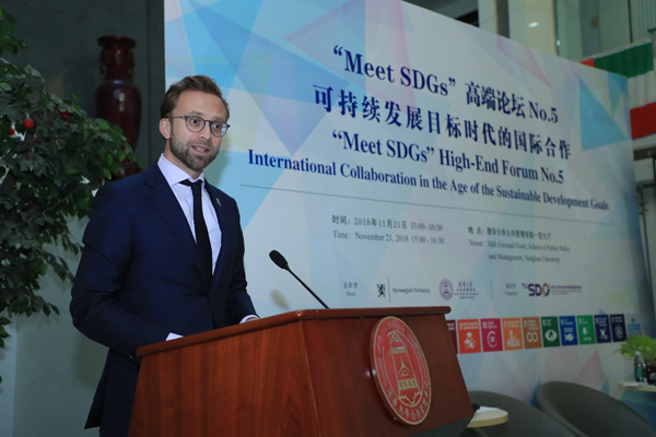 尼古拉·阿斯楚普在主题演讲中提到:自1976年以来,挪威已达到超过0.7%援助水平的国际承诺,并自2013年以来,挪威在对外援助的花费至少达到1%的国民总收入。尼古拉·阿斯楚普表示,联合国2030年可持续发展议程是一个转型的平台,是解决当下挑战和寻找国际合作的新途径,同时这也是挪威发展政策和合作的总体框架。他特别指出,由于海洋塑料垃圾属于全球性的问题,国际合作对于保护海洋动物和海洋生态至关重要,挪威政府也增加今年发展计划的资金以对抗海洋垃圾。最后,他强调每个国家都有实施可持续发展目标的基本责任,且只有通过全世界的共同努力才能获得成功。