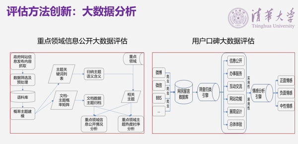本次评估中,采用了定性和定量相结合、人工评估和计算机自动化采集相结合的方法,如人工比对法、电话核实法、模拟测试法、自动扫描监测法等;在对分数的处理上,采用了有无二分法、有效率法、基准线法、标杆值法等。我们还运用了大数据的理念和评估方法,一是对各政府网站的信息内容进行文本分析和挖掘,通过主题建模,分析重点领域信息公开的情况;二是抓取微博、微信、BBS、社区论坛中对政府网站(以及相关信息公开、政务服务和互动交流等)的用户评价口碑数据,对用户视角的实用性、易用性情况进行大数据分析。