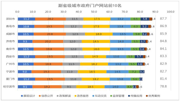 副省级城市政府门户网站前十名:1.深圳,2.青岛,3.成都,4.济南,5.南京,6.西安,7.广州,8.宁波,9.厦门,10.哈尔滨。