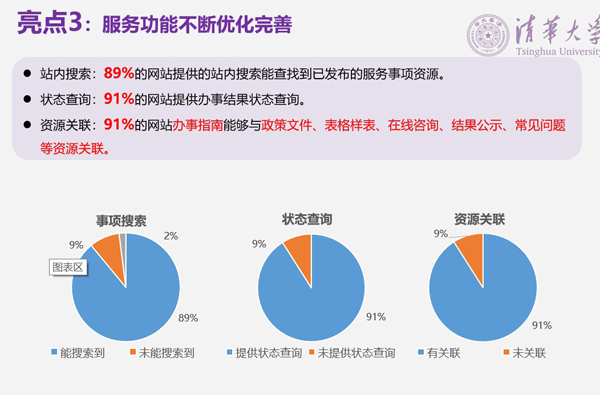 3.服务功能不断优化。89%的网站提供的站内搜索能查找到已发布的服务事项资源,91%的网站提供办事结果状态查询,91%的网站办事指南能够与政策文件、表格样表、在线咨询、结果公示、常见问题等资源关联。