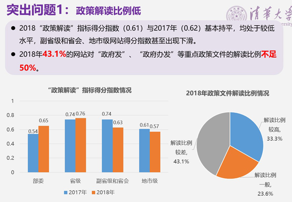 1.政策解读比例低。2018政策解读比例处于较低水平,“政策解读”指标得分指数仅为0.61,与2017年相比,副省级和省会、地市级得分指数出现下滑。43.1%的网站对“政府发”、“政府办发”等重点政策文件的解读比例不足50%。