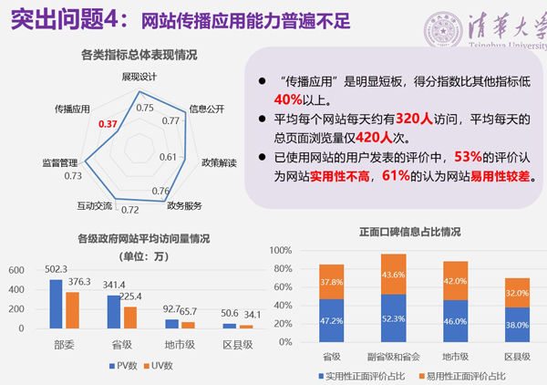 4.网站传播应用能力普遍不足。“传播应用”是明显短板,得分指数比其他指标低40%以上。政府网站年平均页面浏览量不足140万次。已使用网站的用户发表的评价中,53%的评价认为网站实用性不高,61%的认为网站易用性较差。