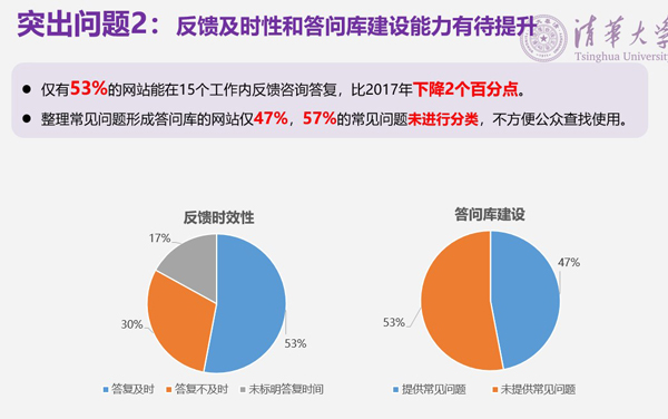 2.反馈及时性和答问库建设能力有待提升。仅有53%的网站能在15个工作内反馈咨询答复,比2017年下降2个百分点。整理常见问题形成答问库的网站仅47%,57%的常见问题未进行分类,不方便公众查找使用。