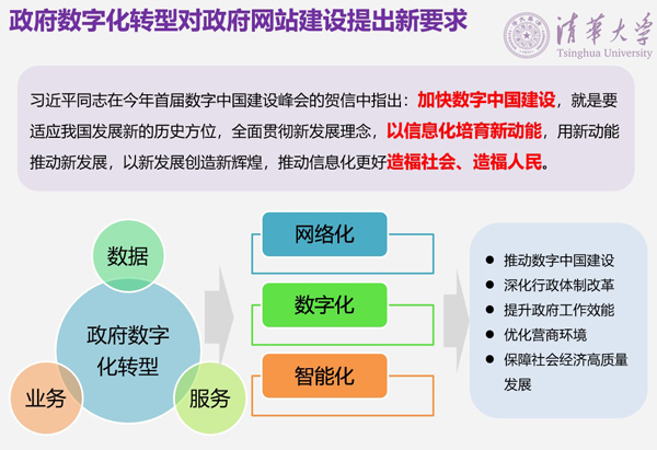 (一)建好政府网站,既是构建数字政府和实现政府数字化转型的关键环节,也是化解人民日益增长的美好生活需要和不平衡不充分发展之间矛盾的切实之举。党的十九大报告对建设网络强国、数字中国、智慧社会做出战略部署,为新时代国家信息化建设指明了前进方向,提供了根本遵循。数字政府建设的良好环境,将为政府网站实现更多能让群众“用得上、用得起、用得好”的信息服务提供强有力的支持,而政府网站发展水平的提升也将极大地增强人民群众对政府数字化转型的获得感,彰显国家治理体系和治理能力现代化的成果成效。