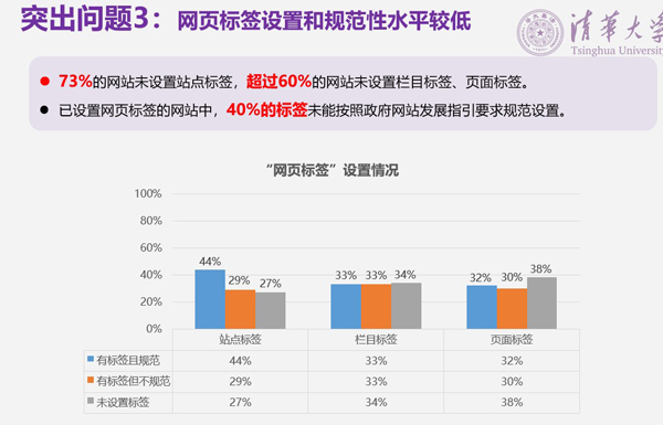 3.网页标签设置和规范性水平较低。73%的网站未设置站点标签,超过60%的网站未设置栏目标签、页面标签。已设置网页标签的网站中,40%的标签未能按照政府网站发展指引要求规范设置。