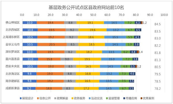 基层政务公开试点区县政府门户网站前十名:1.佛山禅城区,2.北京西城区,3.上海浦东新区,4.金华义乌区,5.深圳罗湖区,6.嘉兴嘉善县,7.西安未央区,8.北京海淀区,9.南京建邺区,10.成都新津县。