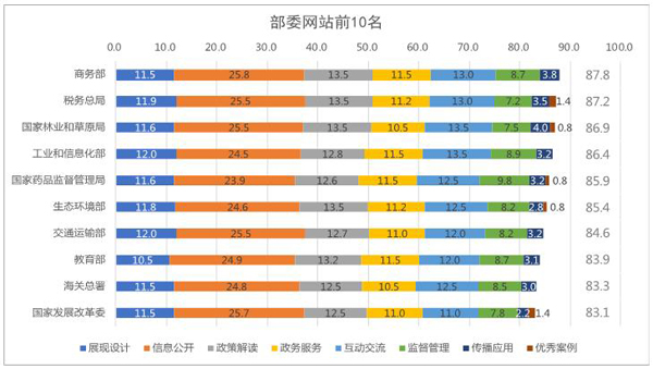 部委网站前十名:1.商务部,2.税务总局,3.国家林业和草原局,4.工业和信息化部,5.国家药品监督管理局,6.生态环境部,7.交通运输部,8.教育部,9.海关总署,10.国家发展改革委。