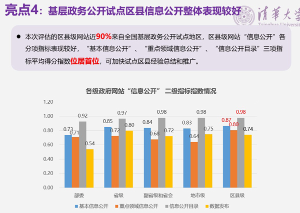 4.基层政务公开试点区县信息公开整体表现较好。本次评估的区县级网站近90%来自全国基层政务公开试点地区,区县级网站“信息公开”各分项指标表现较好,“基本信息公开”、“重点领域信息公开”、“信息公开目录”三项指标平均得分指数位居首位。