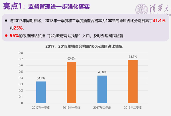 1.监督管理进一步强化落实。与2017年同期相比,2018年一季度和二季度国办政府网站抽查合格率为100%的地区占比分别提高了31.4%和25%。95%的政府网站加挂“我为政府网站找错”入口,及时办理网民监督。