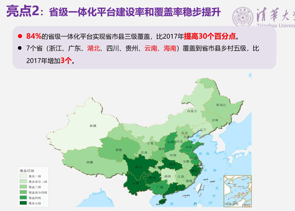 2.省级一体化政务服务平台建设率和覆盖率稳步提升。84%的省级一体化政务服务平台实现省市县三级覆盖,比2017年提高30个百分点。