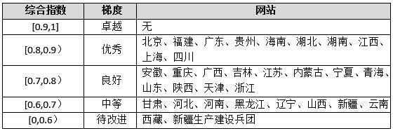 省级政府网站中,10家网站位于“优秀”梯度,12家位于“良好”梯度。省级政府门户网站梯度分布情况如下: