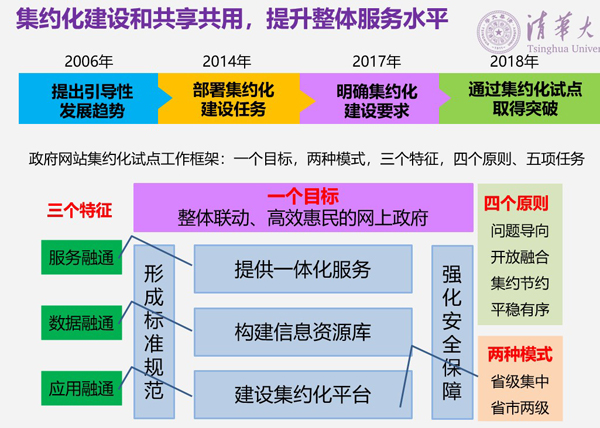 (四)建设基于统一信息资源库的集约化平台,以信息资源共享共用带动政府网站整体服务水平的提升,加快实现构建网上政府的发展目标。2018年11月,国务院办公厅印发了《政府网站集约化试点工作方案的通知》(国办函〔2018〕71号)。基本层面是要解决建设分散、使用不便的问题,通过完善站群管理、内容管理、用户共性应用、运维监管等四个方面的平台功能,提高工作效率,减少重复投入。核心层面是要解决数据不通的问题,通过全平台统一信息资源库,汇聚沉淀本地区各级各类政府网站信息发布、便民办事、互动交流等栏目或系统的信息数据。