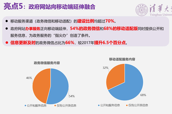 5.政府网站向移动端延伸融合。移动服务渠道建设比例超过70%,54%的政务微信和68%的移动适配版同时提供公开类和服务类信息,为政务服务的“指尖办”创造了条件,66%的政务微信信息更新及时,比2017年提升6.5个百分点。