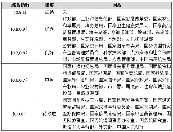 部委网站中,15家网站位于“优秀”梯度,9家位于“良好”梯度。部委网站梯度分布情况如下:
