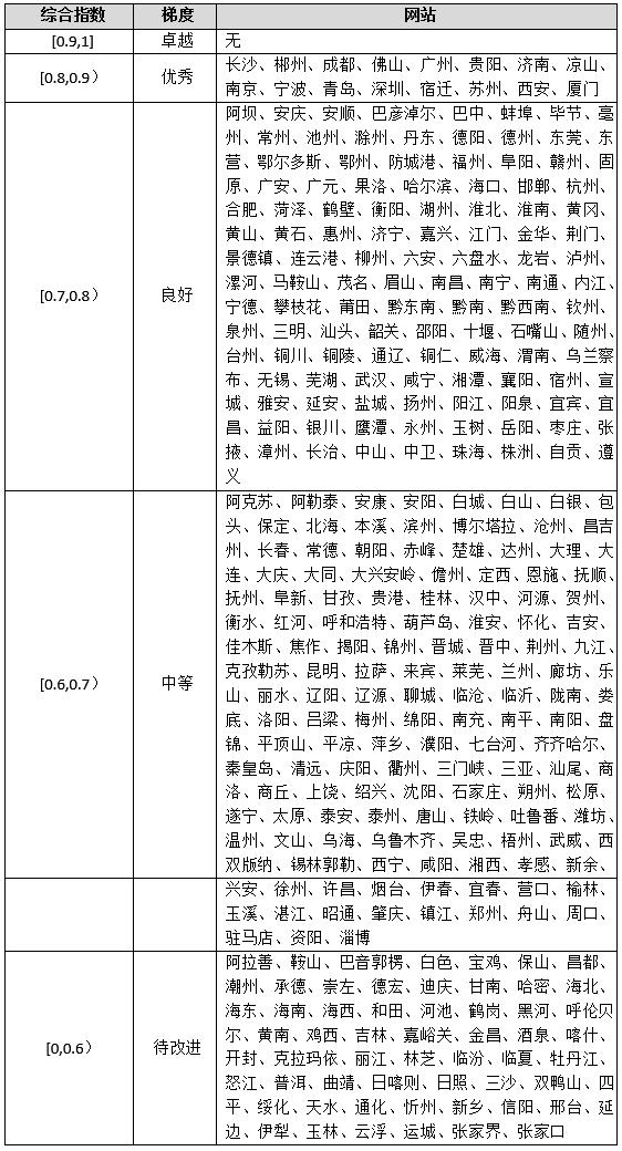 副省级城市、省会城市和其他地市级政府门户网站中,16家网站位于“优秀”梯度,115家位于“良好”梯度。分布情况如下: