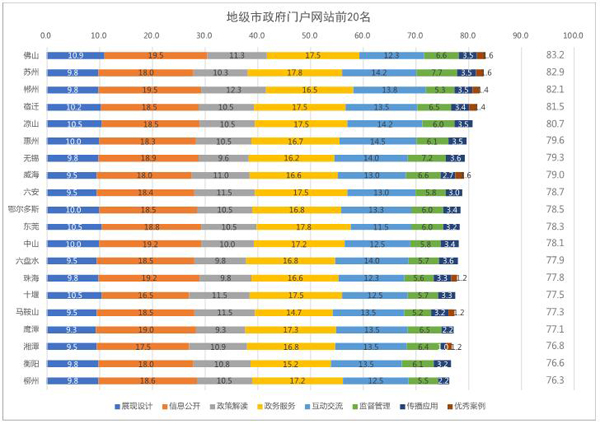 其他地市级政府门户网站前二十名:1.佛山,2.苏州,3.郴州,4.宿迁,5.凉山,6.惠州,7.无锡,8.威海,9.六安,10.鄂尔多斯,11.东莞,12.中山,13.六盘水,14.珠海,15.十堰,16.马鞍山,17.鹰潭,18.湘潭,19.衡阳,20.柳州。