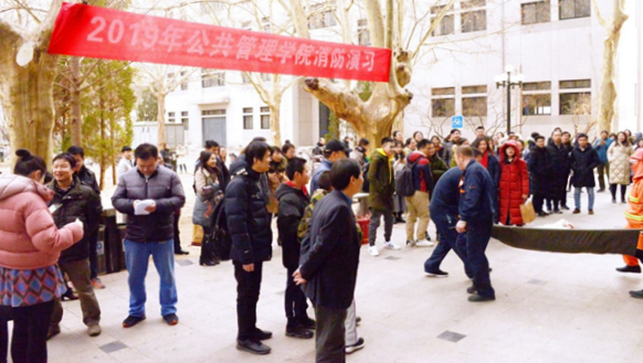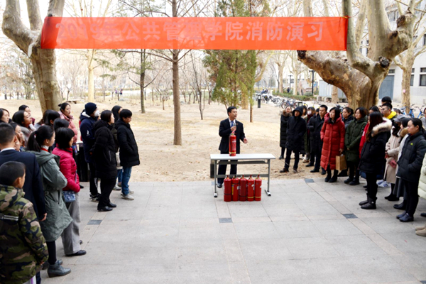 为检验学院办公楼的消防应急系统和现有应急机制运作的有效性,全院100余名师生员工和物业人员在行政办公室的组织下进行了全方位的消防疏散演习。演习分为两个阶段,第一阶段为初期火灾报警确认和扑救。随着火势扩大,演习进入第二阶段,学院启动疏散广播,组织楼内师生进行紧急疏散,启动大楼应急疏散预案,由物业进行火灾扑救并模拟拨打119和学校保卫处电话请求支援。活动现场还讲解了灭火器的使用方法。