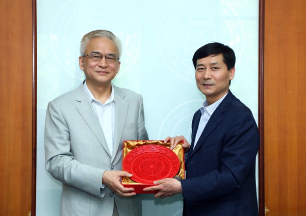 赵劲松代表教育基金会向孙春苗颁发捐赠证书,彭宗超代表公管学院向陈越光赠送纪念品。