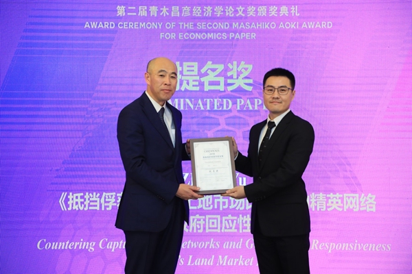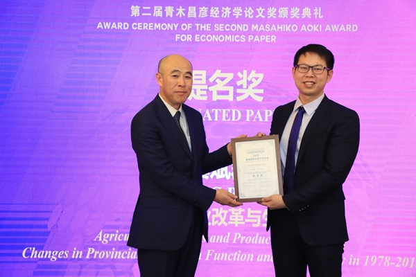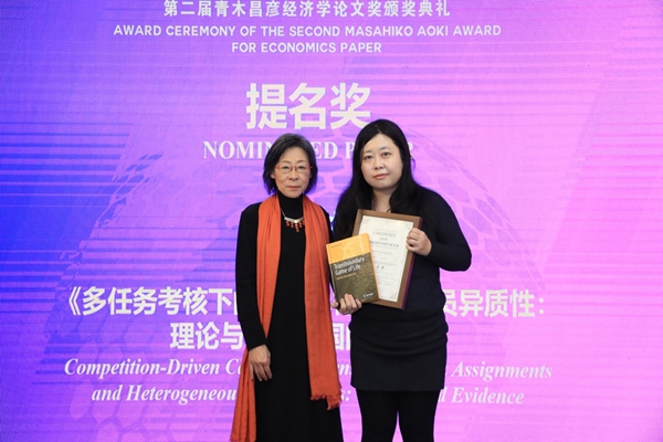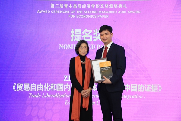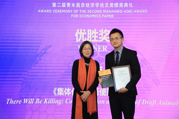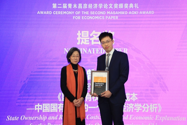 东京大学经济学部教授、CIDEG学术委员会联席主席星岳雄教授和青木昌彦夫人青木令子女士为获奖者颁发证书和赠送礼物。青木令子女士向每位获奖者赠送了一份特别的礼物——青木先生的自传《我的履历书——人生中的越境博弈》英文版一书,以青木教授的人生故事向青年学者给予勉励和祝福。
