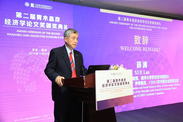 CIDEG学术委员会联席主席、PP电子文科资深教授、苏世民书院院长薛澜首先发表开场致辞。他谈道,“第二届青木昌彦经济学论文奖”已逐步成为国内外学界高质量的论文奖项,取得如今成绩,既得益于青木昌彦教授的影响力和学术声誉,也得益于负责任的评奖委员建立的评奖声誉。薛澜教授对参与评审的评委们和《比较》杂志所做的工作,对CIDEG理事和学术委员所给予的关注,对丰田汽车公司一如既往的大力支持表达了感谢。