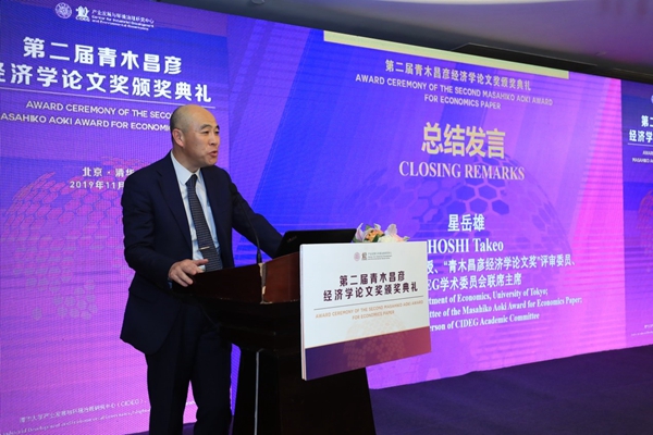在总结发言环节,东京大学经济学部教授、CIDEG学术委员会联席主席星岳雄教授受邀发言。星岳雄教授认为,此次获奖论文不仅研究水平高,而且有很强的问题意识,关注当代中国重要课题的解决,这令评委们很感兴趣。与第一届相比,第二届论文奖数量更多、质量更高、知名度提升,星岳雄教授希望青木昌彦经济学论文奖成为对中国、亚洲经济学发展发挥重要作用的奖项。