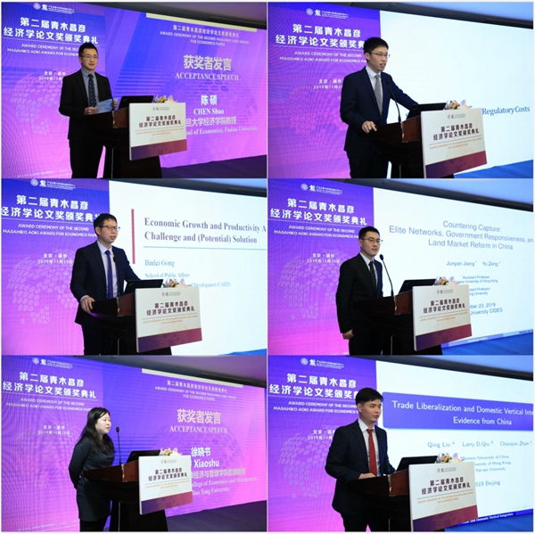随后,主持人陈玲主任邀请获奖作者上台发表获奖感言。各位获奖者对获得该奖项表达了感谢与荣幸,并在发言中简单介绍了自己的研究方向和参赛论文。获奖者发言后,亚洲成长研究所所长、CIDEG学术委员八田达夫,美国加州大学圣地亚哥分校全球政策与战略学院教授、CIDEG学术委员巴瑞·诺顿,作为评审委员代表,对获奖论文的作者表示了祝贺,并表达了自己在评审中的见解。八田达夫教授认为论文分析手法新颖、分析水平高。巴瑞·诺顿表示研究普遍聚焦中国自身问题,具有世界性的普遍意义。北京大学光华管理学院周立安教授,和中欧商学院经济学车嘉华教授也通过精心录制的短片,分享了他们在评选中的感受心得,分享了他们对于青木昌彦教授学术精神的理解。