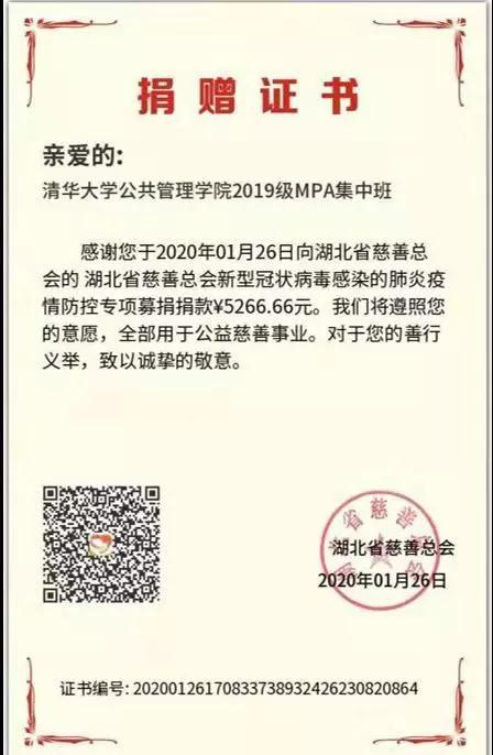 听闻武汉及湖北多地疫情防控物资不足的严峻局面,公管人积极响应党和政府的号召,共抗疫情。1月26日,2019级MPA集中班临时党支部经过商讨,向全班同学发出募捐倡议,为战胜疫情贡献自己的力量。募捐以个人自愿为原则,金额不限。经过一天的募捐,共筹集到善款5266.66元。加上之前有同学以个人名义捐助的1000元,共计6266.66元。筹集的善款以“PP电子2019级MPA集中班”的名义,捐赠给湖北省慈善总会“新型冠状病毒感染的肺炎疫情防控专项募捐”项目,充分体现了公管人的使命和担当。
